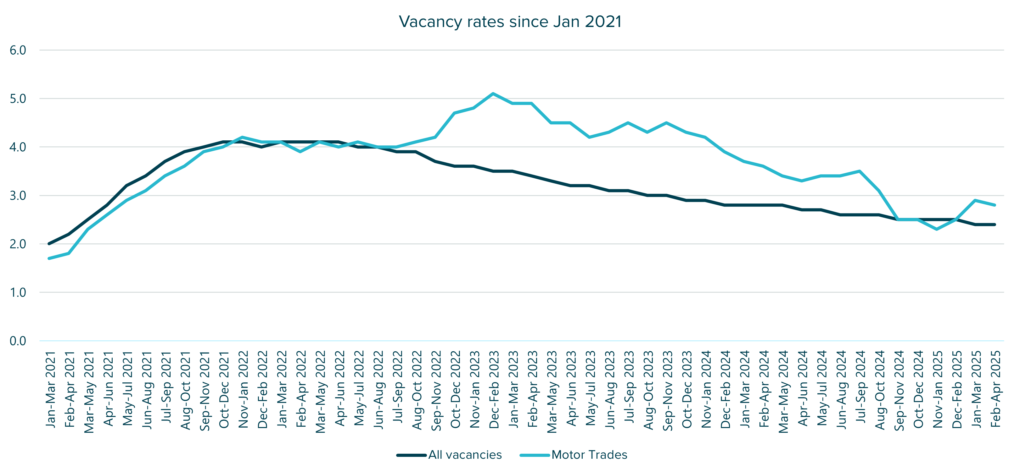 Since April, the Motor Trades sector has seen a reduction of around 1,000 positions, with the vacancy rate falling from 3.4 in May 2024 to 2.7 in May 2025, a 21% decrease. While this may suggest easing recruitment pressures, it also points to a maturing and increasingly competitive labour market.