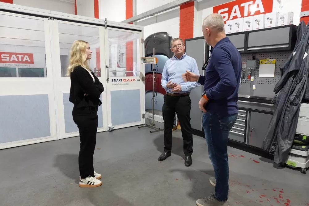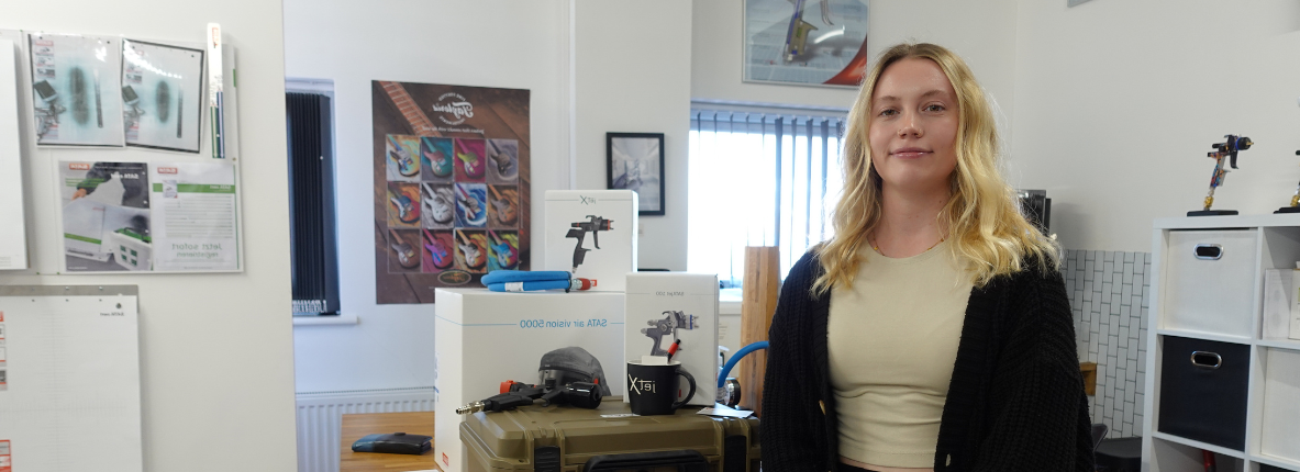 Victoria was invited to visit SATA UK, where she met with Matt Stevens, Managing Director, SATA UK and collected her brand-new equipment bundle. From the start, Victoria knew she wanted to invest her bursary in high-end tools from SATA. After her first few uses of the new spray guns, Victoria was instantly impressed, leaving her able to see to see the long-term potential of the tools on her career. The equipment not only supports her technical work but also adds to her confidence and independence in the workshop, setting her up for continued success.
